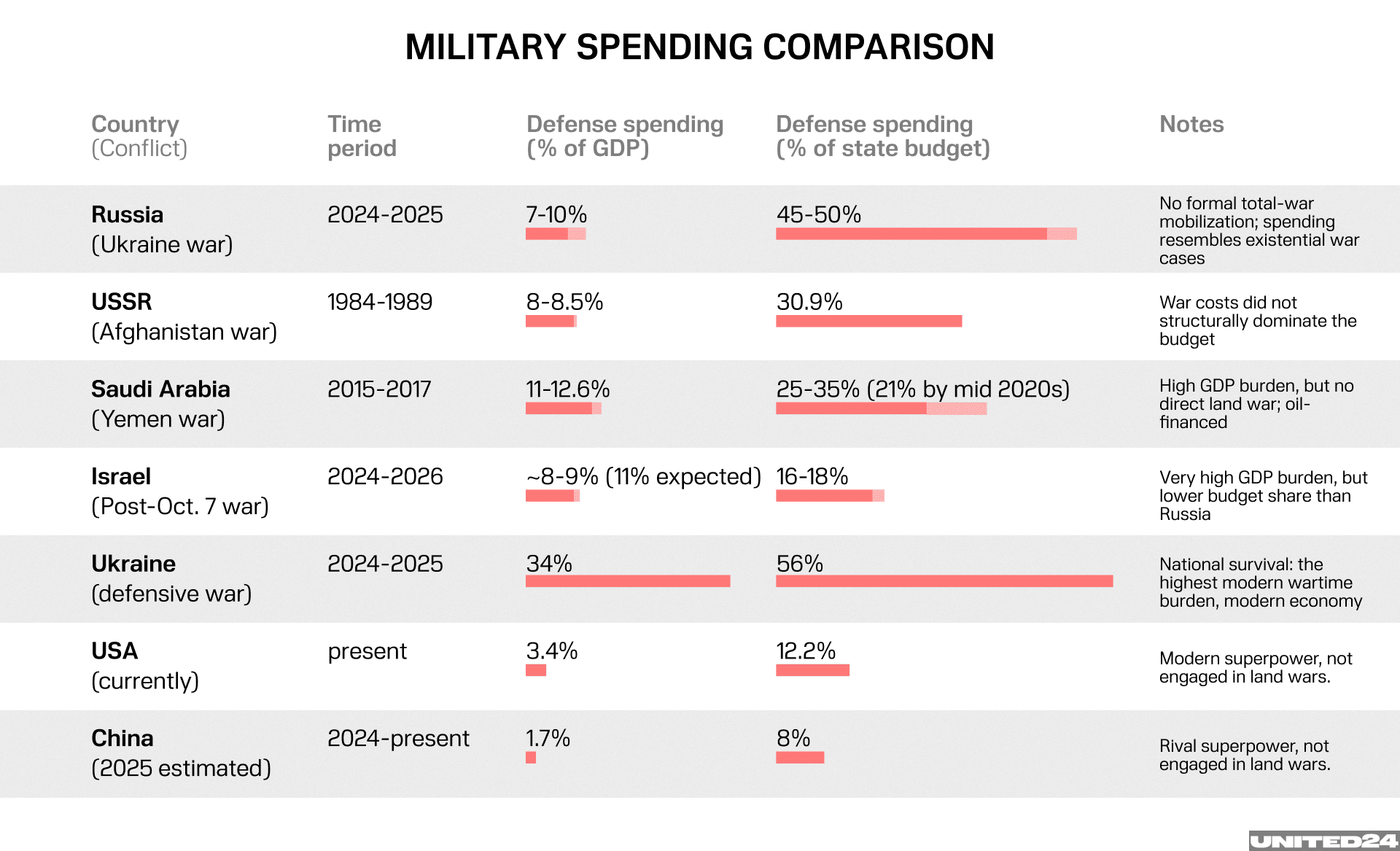 The high percentage of high spending is generally not seen in modern times. To see similar cases, we have to go further back into history. The most relevant comparisons are the UK, USSR, and Nazi Germany, as major powers of the conflict, and with Russia's geographical proximity to the conflict, similarly to Russia presently.