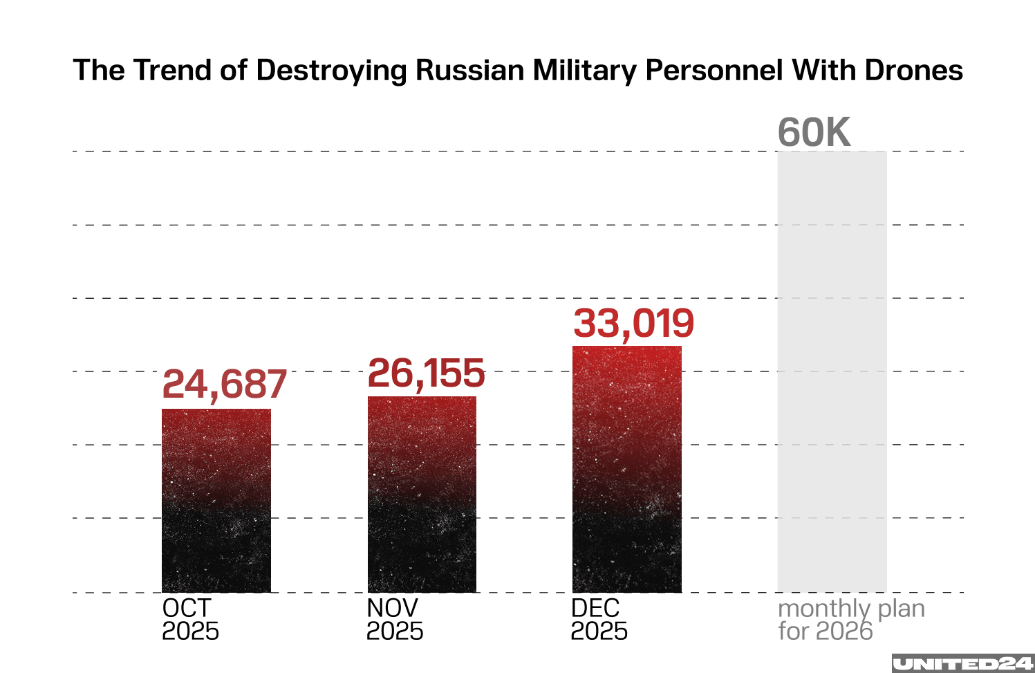 Ukrainian President Volodymyr Zelenskyy released striking statistics in early January 2026: Ukrainian drones struck 35,000 Russian troops in December 2025 alone. This includes killed or wounded and considered irrecoverable. This figure also covers all drone-related strikes; the Unmanned Systems Forces themselves were responsible for about 13,000 hits, roughly 40% of the total, says the head of Ukraine’s Unmanned Systems Forces, Robert “Madyar” Brovdi.