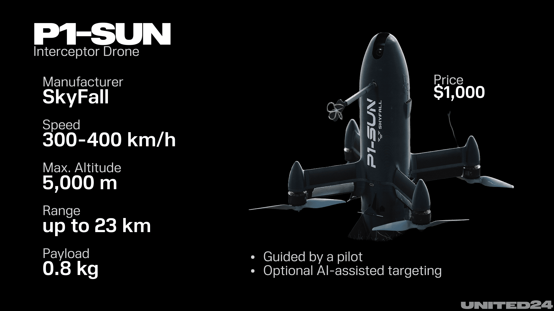 The interceptor can be guided by a pilot and, through AI, automatically lock the target during its final phase. The model has a daylight and a thermal camera, allowing it to detect Shahed engine heat at night. It can hold some warheads weighing 500 grams, according to the company.