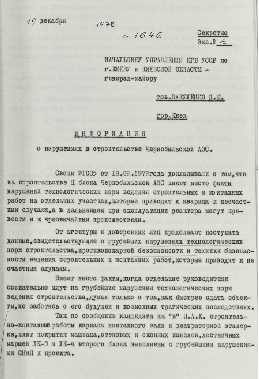 For example, a KGB report from December 1978 on the Chornobyl Nuclear Power Plant, declassified in modern Ukraine, stated: