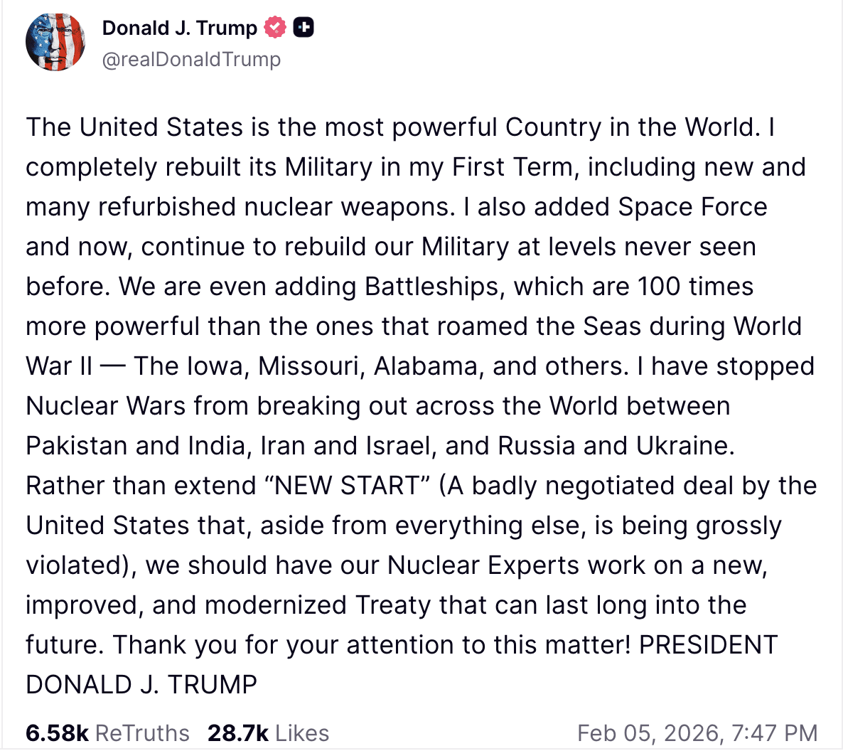 Writing on his Truth Social platform, Trump called for nuclear experts to work on a "new, improved, and modernized Treaty". Reports also suggest that Washington and Moscow might be approaching a temporary "gentlemen's agreement" to observe limits, negotiated on the sidelines of talks in Abu Dhabi.